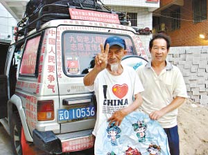 記者在廣州中大北門后面的一個小旅館見到了張汝侯、張光澤父子和他們貼滿奧運宣傳標語的越野車。張汝侯老人1919年出生,白族人,走路有點顫抖,很難相信他坐車行了31個省市自治區、341個市、2000多個縣。
