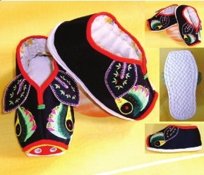 周阿姨店里的兜肚、針織品類都是她自己做的,繡花鞋是她70多歲的母親繡的,鞋底是周阿姨納的。周阿姨每天的工作強度看訂單的多少,忙的時候要做到晚上11-12點(是邊看電視邊做),做不完還要找幫手,不忙的時候一上午就差不多能完成。