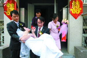 昨日,新郎劉存貴準備抱新娘王丹去酒店舉行結婚宴會。 記者 王嘉寧 攝