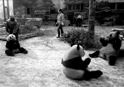 北京動物園副園長張金國介紹,老熊貓館里的兩只成年大熊貓隨后將被接到奧運熊貓館“補缺”。(記者 段九如)