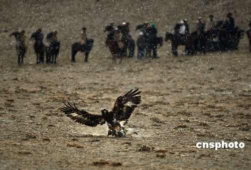 3月21日上午,在“中國獵鷹故鄉”新疆阿合奇縣蘇木塔什鄉獵鷹場上,全縣百余名獵鷹人帶著獵鷹為參加“第二屆獵鷹文化節”的游客展示“放飛獵鷹”、“獵鷹捕兔”、“獵鷹活捉狐貍”等民族特色節目。 中新社發 馬衛平 攝