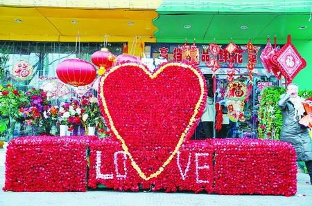 訂購花的小伙子姓劉,登封市人。當(dāng)天上午8時許,位于登封市望箕路與嵩關(guān)街交叉口的“浪漫情人鮮花禮品店”門前,擺放了一個由10001朵玫瑰做成的造型,造型中間有一個用黃色玫瑰圍起的“心”形圖案。下面有用粉色玫瑰擺出的“l(fā)ove”英語單詞。整個造型分成三部分,全長5米,寬1.2米,高1.8米。