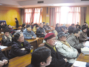 記者昨天下午在南京下關法院二樓會議室看到,會議室里濟濟一堂,全是上了年紀的老頭老太,正全神貫注地盯著眼前一塊投影幕布,幕布前,一名女法官正手執木棒,指著幕布上的文字和圖表,大聲朗讀。