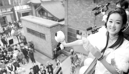 穿著古裝的王芊抱著繡球,一直站在陽臺上“逗”觀眾。剛做好要拋的動作,樓下一群年輕男子睜大眼睛,紛紛做好跳躍搶球的姿勢。眼看球要拋出來了,王芊把手突然縮回去了!鞍パ剑 眳⑴c者、圍觀者都感到自己被“耍”了。“快點丟嘛!”樓下的男子們已經等不及了!翱磥韲H小姐的繡球不好接啊!眹^的大爺大媽也忍不住笑著說。