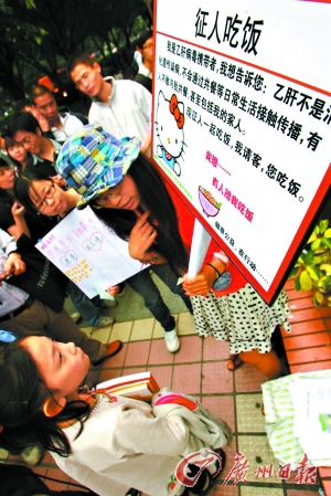 “我是乙肝病毒攜帶者,我想告訴您:乙肝不是消化道傳染病,不會通過共餐等日常生活接觸傳播,有人不敢與我共餐,甚至包括我的家人。現征人一起吃飯,我請客,您吃飯。”昨日,廣州購書中心門前,一名女孩高舉著這樣一塊牌子要征人一起吃飯。女孩的網名叫鋤草,是一名留日海歸,跟網友成立了“鋤草”科普組織,專門進行乙肝科普活動。