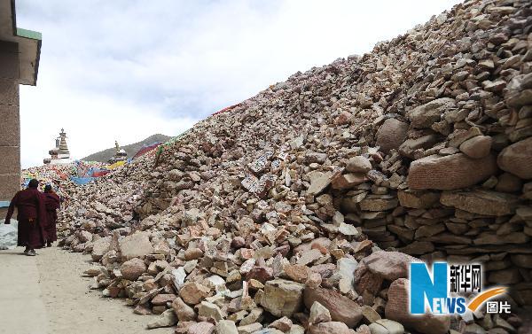 4月19日,國家級物質文化遺產嘉那嘛呢石堆受損嚴重。 據青海省文物局通報,在玉樹地震受災區域中,眾多文物受損嚴重,大量建筑倒塌,珍貴文物被埋。 新華社記者 江宏景 攝