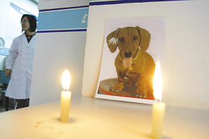 昨日下午,南京市畜牧獸醫(yī)站寵物醫(yī)院內(nèi),進(jìn)門的方桌上,一張寵物狗生前的照片,幾許燭光讓人勾起對愛犬的思念,幾名身穿白衣的工作人員也為小狗的不幸感到惋惜。狗主人韓女士告訴記者,照片上這條臘腸犬名叫“帥帥”,是一條3歲多的公狗,這三年多來與她朝夕相處,感情很深。從5月2日開始,她發(fā)現(xiàn)平時活潑好動的帥帥變得沉悶,不喜動,食欲很差,還伴隨著嘔吐,明顯是生了病。愛犬變成這樣,韓女士心疼不已,帶著它來到位于四平路附近的一家寵物醫(yī)院治療。