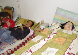 今年59歲的黃瑞根,家住鎮江新區銀山鑫城小區,曾是名醫生。昨天上午,記者來到黃瑞根與妻子所住的車庫里,推開門就看到窄小的空間里擺放著兩張床。黃瑞根正因晚期骨癌引起的劇痛,在痛苦地呻吟;妻子則睡在他的旁邊,鼻孔里插著一根導管,雖然是個“睡”了3年多的植物人,但面色紅潤。
