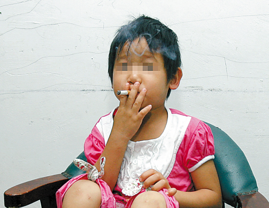 小雅文抽煙的動(dòng)作利索得令人吃驚,她用右手食指和拇指夾著香煙,悠然自得地點(diǎn)燃,叼在嘴邊,深吸一口,白煙從嘴里和鼻孔慢慢連貫地吐出,中指還不時(shí)地彈掉煙灰,抽煙動(dòng)作儼然是一名老煙民。短短5分鐘,就連續(xù)抽了兩根煙。她只是一個(gè)不到4歲的女孩,煙齡已經(jīng)將近一年。