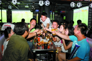 一家酒吧內,球迷們笑稱“今晚酒吧被我們老板包場”,公司老板為球迷,特意四年一次讓員工徹底放松,痛快暢飲看球。“公司內部看球是傳統,曾經還組織過全北京市的足球比賽。”一名自稱曾當過守門員的球迷說,老板為了讓大家看球,明早上班時間推遲到10點半。