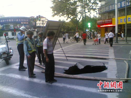 16日下午6時(shí)40分許,位于南京長樂路與箍桶巷的交界處的地面突然塌陷,露出直徑兩米、深三米的大坑。事發(fā)地點(diǎn)位于主干道,“居中”于斑馬線上,此處人車流十分密集,F(xiàn)場的輔警、交警急忙找來長竹竿圍擋,防止人車二次陷落。