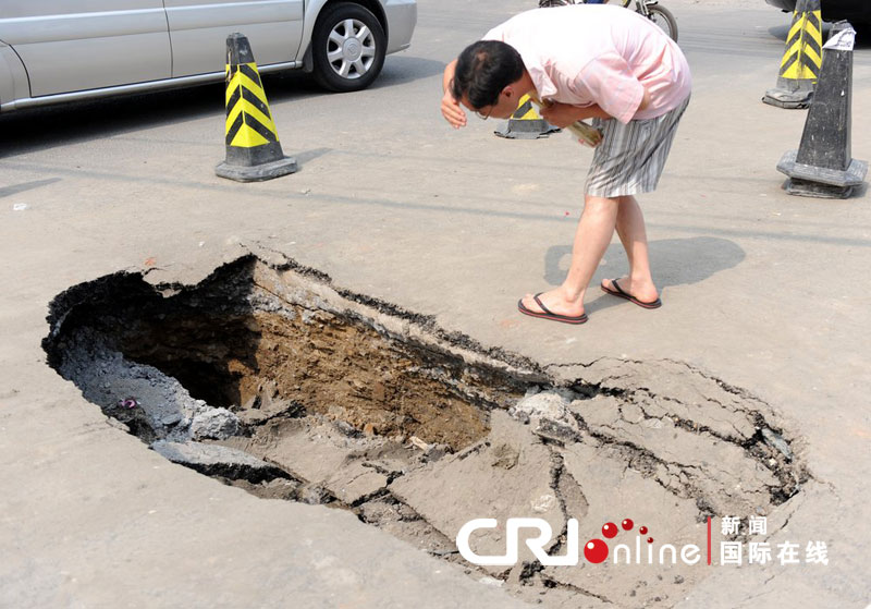 2010年6月19日中午,北京朝陽區將臺西路與酒仙橋路交界處,路面塌陷現2米深坑,幸無人員傷亡。路面塌陷現2米深坑,一名路人彎腰觀看。