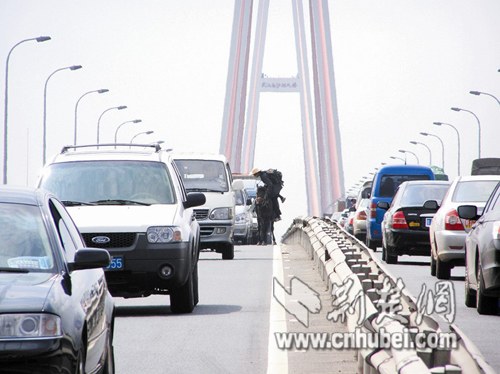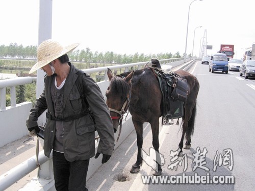 頭頂草帽、肩挎背包,一身厚厚的休閑服,跨下威武的棗紅馬。昨日下午,武漢三環線長江三橋橋面出現的這名騎士令過往車輛驚愕讓路,交警緊急趕到極力勸阻后將游俠護送離開城市快速路面。