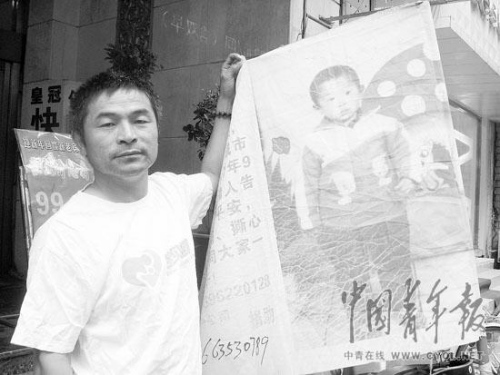 這張照片被郭剛堂放大,印在一張一平方米大小的白油布上,制成一面旗子。這面插在摩托車后座上的“尋子旗”,陪伴郭剛堂走過一個又一個陌生的地方。旗子上,大大的楷體字非常顯眼:“兒子,你在哪里?爸爸找你回家。”