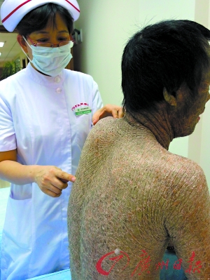 廣州市皮防所的醫護人員為全身長滿魚鱗狀角質皮膚的患者進行檢查。記者陳安