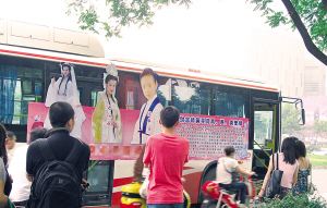昨日上午10點(diǎn)半,細(xì)雨濛濛。南京鼓樓廣場(chǎng)上,一輛74路公交車圍著廣場(chǎng)慢悠悠地繞圈。就在過往路人納悶之際,轉(zhuǎn)過來的車身解開了謎底,原來是一名億萬富豪搞的征婚秀。只見面向慢車道的車身上,醒目地貼著大幅彩色噴繪寫真橫幅,從左到右依次是白素貞、七仙女、祝英臺(tái)的人物劇照。車身上密密麻麻的,是這名富豪的愛情書:一定要找一名集上述三女子優(yōu)點(diǎn)于一身的人為妻。