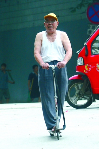 穿著一件白色背心和深色短褲,一頂黃色鴨舌帽掩不住花白的頭發(fā),當(dāng)87歲的李海和大爺腳踩滑板,以這種“拉風(fēng)”的形象出現(xiàn)在人們面前時(shí),回頭率極高。李大爺自稱踩滑板有七年了,不論是外出游玩,或買(mǎi)菜購(gòu)物,他都踩著它。
