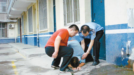 幼兒園園長兼司機(jī)朱雷剛走出羈押室,“撲通”一聲跪下,向涵涵和她的父母懺悔。記者王濤 實(shí)習(xí)生盧夢純 攝