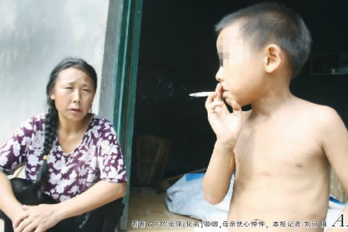 與其他同齡人相比,張強(qiáng)明顯長(zhǎng)得要矮一些,稀疏的頭發(fā)又黃又短。張強(qiáng)的母親說,平時(shí)孩子雖然也要吃三頓飯,但每頓飯只是匆匆吃完一碗即說不餓,常常是丟下飯碗就不見了。再一找,他躲在屋后一手拿煙,一手捧個(gè)茶杯,儼然一副小大人模樣。