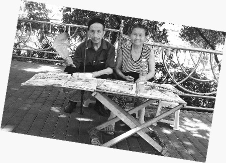 徐碧玉(右)老人和老伴在臨江門賣報(bào)記者 唐浩 實(shí)習(xí)生 蔣雨龍 攝