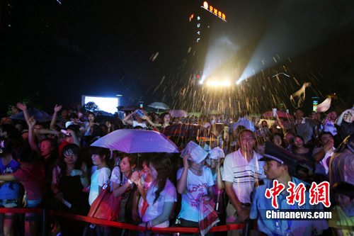 在開(kāi)幕晚會(huì)上,原花兒樂(lè)隊(duì)主唱大張偉的精彩演出更點(diǎn)燃了重慶市民的熱情,F(xiàn)場(chǎng)隨處可見(jiàn)被啤酒淋得全身濕透的市民,毫不在意地?fù)]舞著手中的熒光棒與臺(tái)上的歌手互動(dòng)。