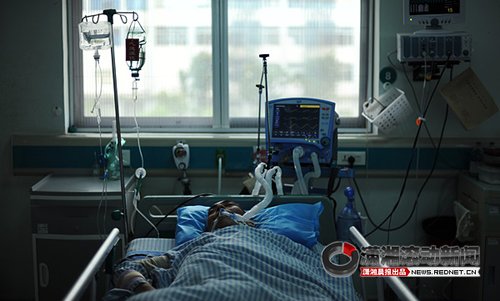 9月2日,湘潭市中心醫院重癥監護室,周道明嘴里插滿了呼吸導管,醫生說不馬上手術他會有生命危險。圖/楊抒懷