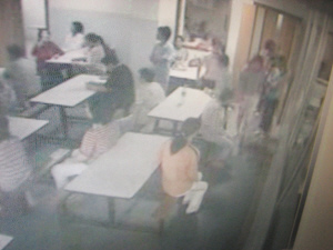 監(jiān)控室位于醫(yī)院精神康復(fù)中心旁邊的一棟三層小樓內(nèi)。記者來到那里時(shí),朱金紅所在位置的影像已被接到一臺(tái)電腦的屏幕上。王麗娟告訴記者,那是康復(fù)中心的食堂,病人們剛剛吃晚飯,有的坐著閑聊,有的已經(jīng)離開了。“朱金紅剛走了,快,打電話讓護(hù)士把她叫回來!蓖觖惥赀@樣吩咐辦公室那位工作人員。