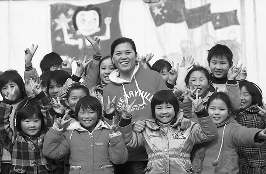 今年1月28日,被評為“2009年度感動中國十大人物”的河南周口淮陽許灣鄉希望小學校長李靈,在學校和孩子們高興地跳了起來。2009年6月,李靈為實現給孩子們搭建簡易“閱覽室”的夢想,在鄭州街頭四處奔波,推著三輪車高價收購小學生教輔課外讀物等。陳曉東攝(資料圖片)