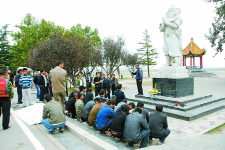 在鄭州北郊花園口景區(qū)門口有尊河神將軍塑像,11日,有30多名農(nóng)民工代表在這個塑像前焚香殺雞祭拜。他們想讓河神顯靈,幫他們拿到被拖欠的675萬元工錢。(10月12日《河南商報》)