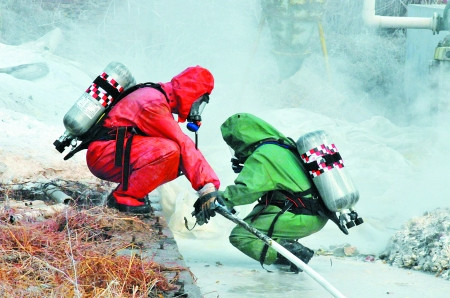 消防人員在現場進行稀釋降毒。記者 陳偉 通訊員 敬寬 圖