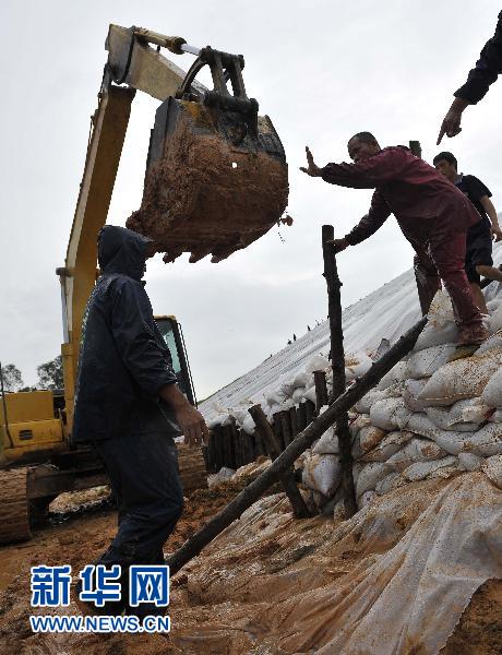 10月18日,海南省陵水縣竹俐水庫工作人員正在打樁,加固堤壩。新華社記者 郭程 攝