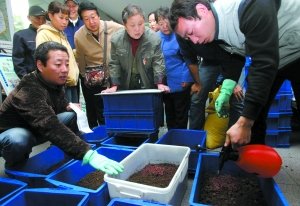 昨日,在東四七條居委會,前來領蚯蚓的居民圍在11個塑料儲物箱邊,民間環保組織地球村的工作人員張強戴著手套,一邊給每一只箱子配泥土和定量的蚯蚓,一邊給大家講解養殖蚯蚓的事項,“菜葉、果皮薄薄鋪一層即可,一天不要超過一公斤,最后用土蓋上”。