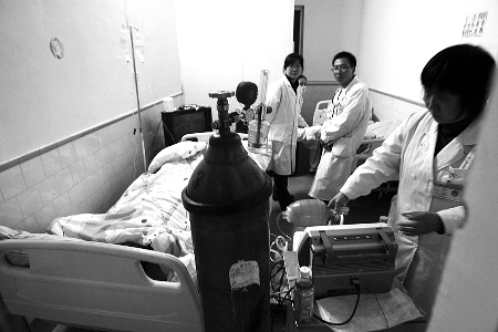 隔著窗戶,記者看到搶救室是一間病房,里面有氧氣瓶和監(jiān)護(hù)儀等設(shè)施。死者靜靜地躺在病床上,身體被被子包裹著,在他身旁,監(jiān)護(hù)儀顯示心跳已成一條直線。室內(nèi),4名醫(yī)護(hù)人員無奈地或坐或站。在他們記錄的病歷上顯示,他們已被困在屋內(nèi)好幾個小時了。