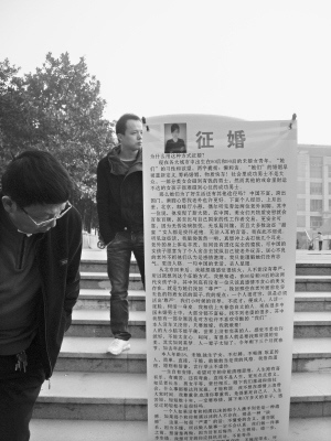 記者現場看到,征婚牌上洋洋灑灑寫了近2000字,其中不乏“現在大城市的80后和90后未婚女青年兩字可概括:懶和貪”、“他們的婚姻是籌碼,搭乘的是物質快車”等“雷人”話語,吸引不少路人駐足觀看。