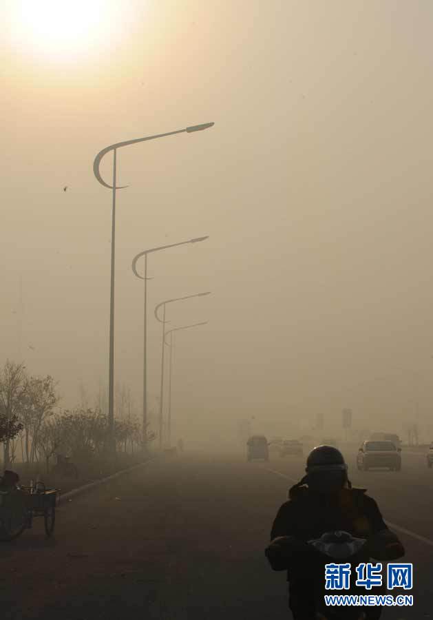 11月19日,一名市民在霧中騎車前行。當天,一場大霧彌漫天津市區,由于能見度偏低,導致京滬高速天津段和津塘等高速路段封閉。新華社記者岳月偉攝