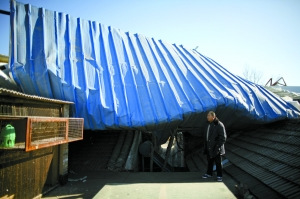 昨日,孫河上辛堡村,一戶自建彩鋼棚被前夜大風吹飛,掉在鄰家屋頂。本報記者 浦峰 攝