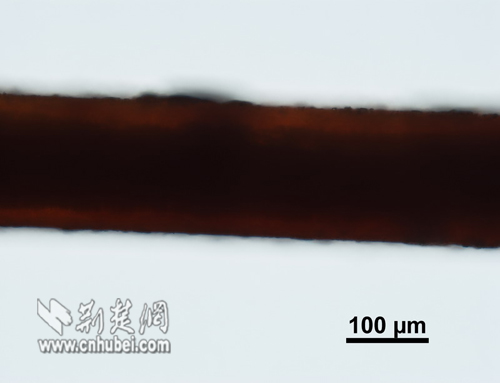 物鏡20倍下的馬尾毛,能隱約看到毛腔,腔壁厚實,過度不明顯,外表粗糙,鱗片翹起很多,曾有專家認定不明動物毛發就是這種毛發