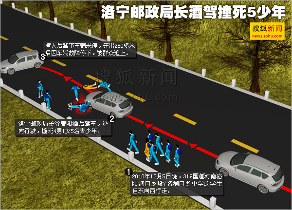 據通報,12月5日23時30分許,洛陽市洛寧縣郵政局局長谷青陽,酒后駕駛黑色帕薩特牌轎車,沿S319省道(安虎線)由東向西行至79公里處(洛寧縣澗口鄉東村路段),逆向行駛與道路南側多名行人相撞,造成洛寧縣澗口鄉中學3名初中生當場死亡,澗口鄉2名青少年搶救無效死亡,并導致車輛損壞。