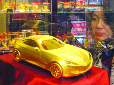 昨天,在南京寶慶銀樓舉辦的金條展上,一輛由純金打造的黃金汽車在南京首次亮相,成為當天展會最大的亮點,別小看它只是一個汽車模型,它可用了足足5公斤黃金,按時下的金價計算,市價值300多萬元呢,一點不比那些真正的跑車便宜。記者在展銷會上看到,除價值不菲的黃金跑車外,寶慶銀樓今年還推出了兔年生肖金條、記載祖宗淵源的姓氏金條等特色產(chǎn)品,重量從10克到1.5千克不等。其中,投資金條在上海金交所基礎(chǔ)金價上每克加價10元銷售,工藝金條每克加價15元。(陳春林)