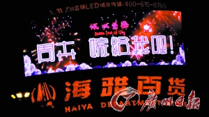 當晚8時整,南城鴻福路口人流穿梭,熙熙攘攘,周末時光,逛街休閑的市民明顯比平時多了很多,就在這時,海雅百貨大樓上的LED大屏幕突然中斷正在播出的內容,隨之出現一段浪漫求婚大片吸引了路人的眼球。