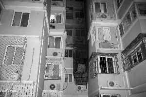 昨日,東直門內大街4號樓,起火房屋附近的外墻被熏黑。本報記者 王嘉寧 攝