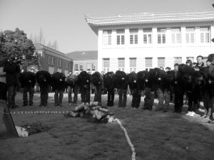 按原計(jì)劃,悼念儀式是昨天(12月17日)上午九點(diǎn)半正式開始。但還沒到8點(diǎn),復(fù)旦大學(xué)學(xué)生會的成員就已陸續(xù)來到了悼念儀式舉行地——燕園。他們在集合后便開始清掃燕園的草地;有的則用白色蠟燭在草地上擺成一個(gè)心形圖案,并將張寧海的遺像放進(jìn)圖案中央;同時(shí),在通向燕園世紀(jì)鐘的石子路上,學(xué)生們還用黃色的康乃馨鋪在路的兩側(cè)……