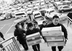 近期,治堵傳聞讓北京新車上牌數(shù)量明顯增多。圖為北京岳各莊檢測場,工作人員正在緊急調(diào)運4000副新車牌。記者 賈寧攝