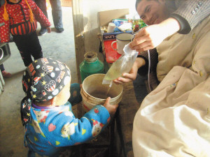 身高尚不足一米,言語也不清晰的董心怡對記者的到來并不怯場。在和其他同齡孩子玩耍時,也一樣俏皮。但在董建設(shè)的病床前,三歲的她卻格外聽話。在董建設(shè)的吩咐下,她熟練地找來尿盆,將董建設(shè)導(dǎo)出的尿接走,并且麻利地倒在屋外的茅廁中……
