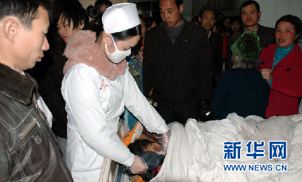 12月27日,醫(yī)護(hù)人員正在搶救受傷的孩子。當(dāng)日早晨,湖南衡南縣松江鎮(zhèn)一輛由東塘村開往因果村的三輪車運送20名小學(xué)生,在駛到因果橋時,發(fā)生交通意外,整車墜入河中。截至目前,遇難人數(shù)已上升至14人,其他6名受傷學(xué)生正在醫(yī)院接受救治。新華社記者 韓曦樂 攝