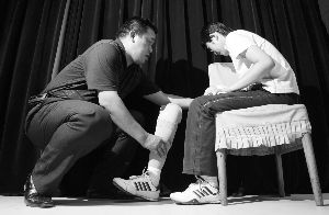 小皮的父親正在給女兒戴假肢。2007年,小皮出車禍飛蘭州治療,遭拒延誤治療右腿截肢。本報(bào)資料圖片 浦峰 攝