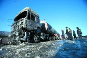 昨日,事發(fā)油罐車燒得只剩鐵架,救援人員正進(jìn)行安全檢查。本報記者 王嘉寧