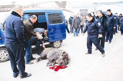 野豬闖入工廠宿舍區 民警連開13槍將其擊斃(圖)