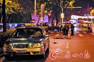 昨晚記者趕到現場,警方已拉上封鎖線,對現場進行勘驗,并將肇事司機帶上警車。記者看到,肇事男司機中等身材,身高1.72左右。斑馬線的北邊約15米處,倒在血泊之中的林先生已被一塊大布覆蓋。在尸體北面的六七米之處,一輛車牌號為粵A694B8的綠色出租車停在路邊。記者借助路燈,卻沒看到馬路上有任何的剎車痕跡。路邊的目擊者稱,當時的車速飛快,估計都沒剎車。
