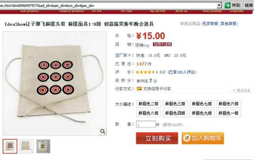 一部《讓子彈飛》令“麻匪面具”紅透半邊天。在淘寶網(wǎng)上,“麻匪面具”、“麻匪帽”、“麻匪頭套”等衍生品銷售異常火爆。在搜索欄鍵入“麻匪面具”,相關(guān)寶貝多達(dá)491件,價(jià)格從9元到30元不等。在淘寶商城一家店鋪里,記者看到,短短30天就賣掉了1477件“麻匪面具”。售賣“麻匪面具”的西安一家網(wǎng)店的客服告訴記者,從1筒到9筒,大哥“張麻子”戴的9筒,以及麻匪火并時(shí)混淆陣仗的4筒最為熱銷。